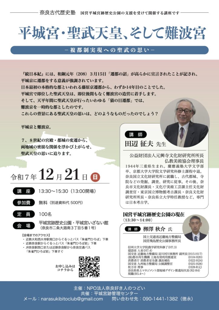 参加費:無料(資料代500円)(国営平城宮跡歴史公園の支援を受けて開催する講座です)