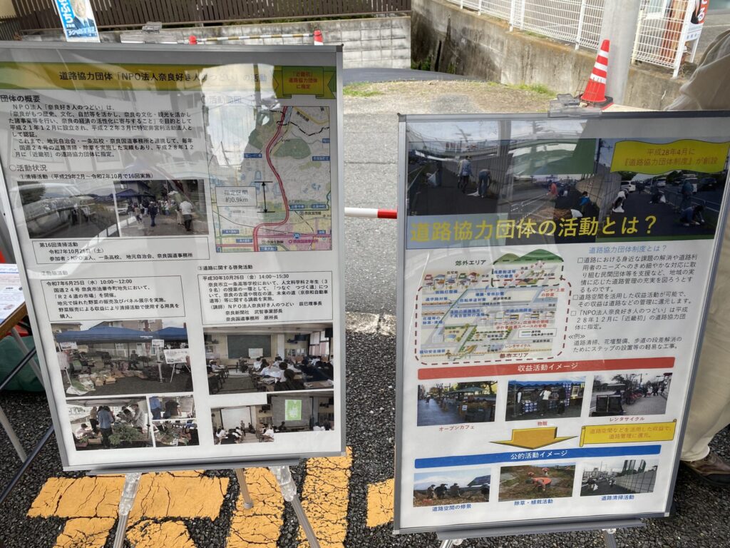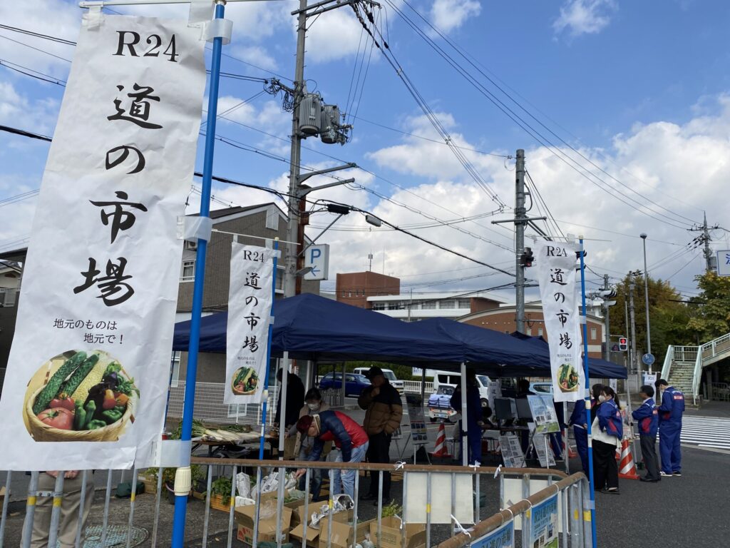 道路協力団体の活動として、年に2回開催している道の市場。 場所は、一条高校前の交差点の一角。 ご近所のみなさんに浸透してきたようで、ご存知いただいている方も多くなってきました。 ほうれん草や大根など100円から200円程度の新鮮な野菜と、奈良市都祁地域で手作りされているジャムなどの販売、そして、奈良国道事務所ブースでは、道路協力団体の紹介や管理道路のパネル展示も行いました。 とにかくお天気の良い日、市場日和でした。 お買い求めいただいたみなさま、ありがとうございました。